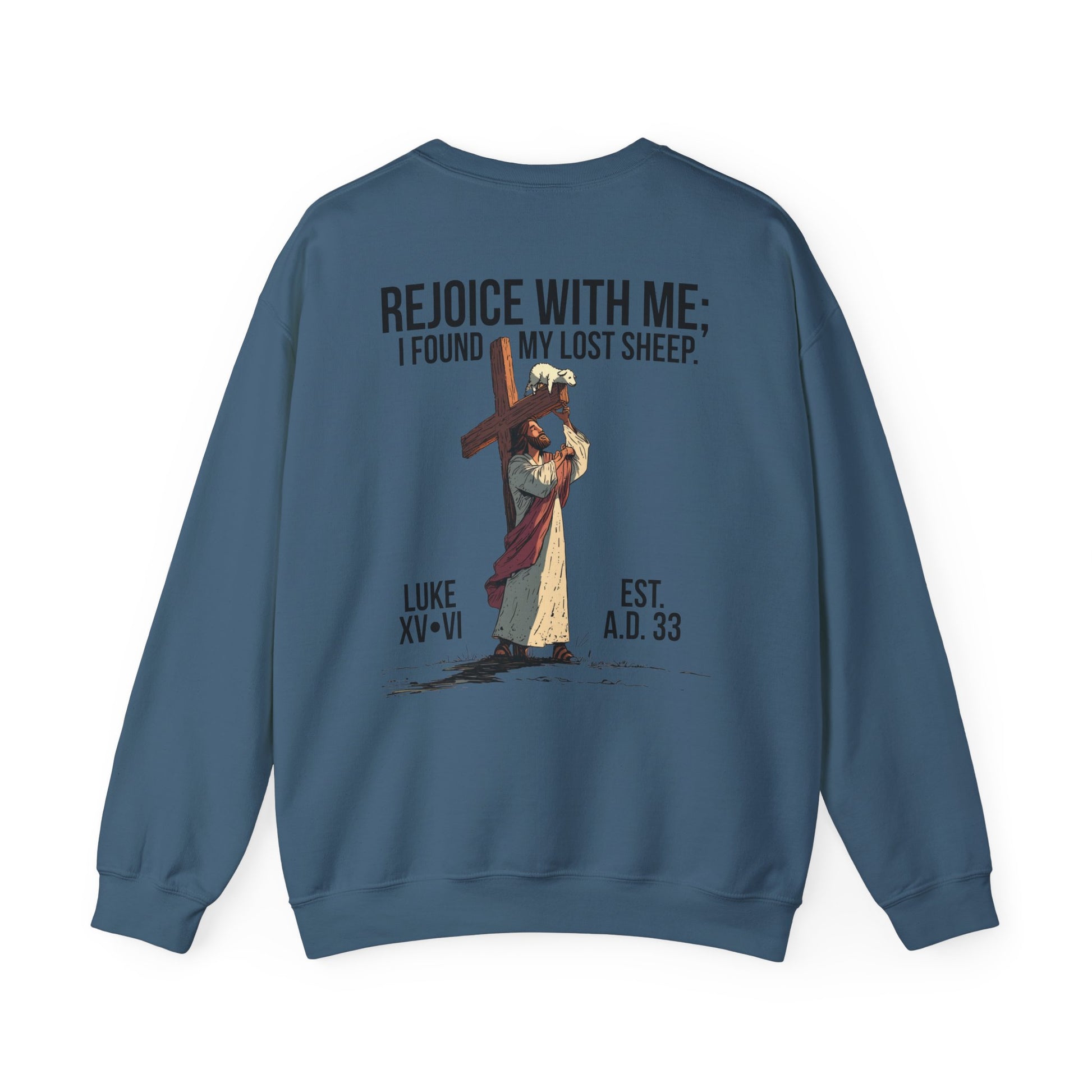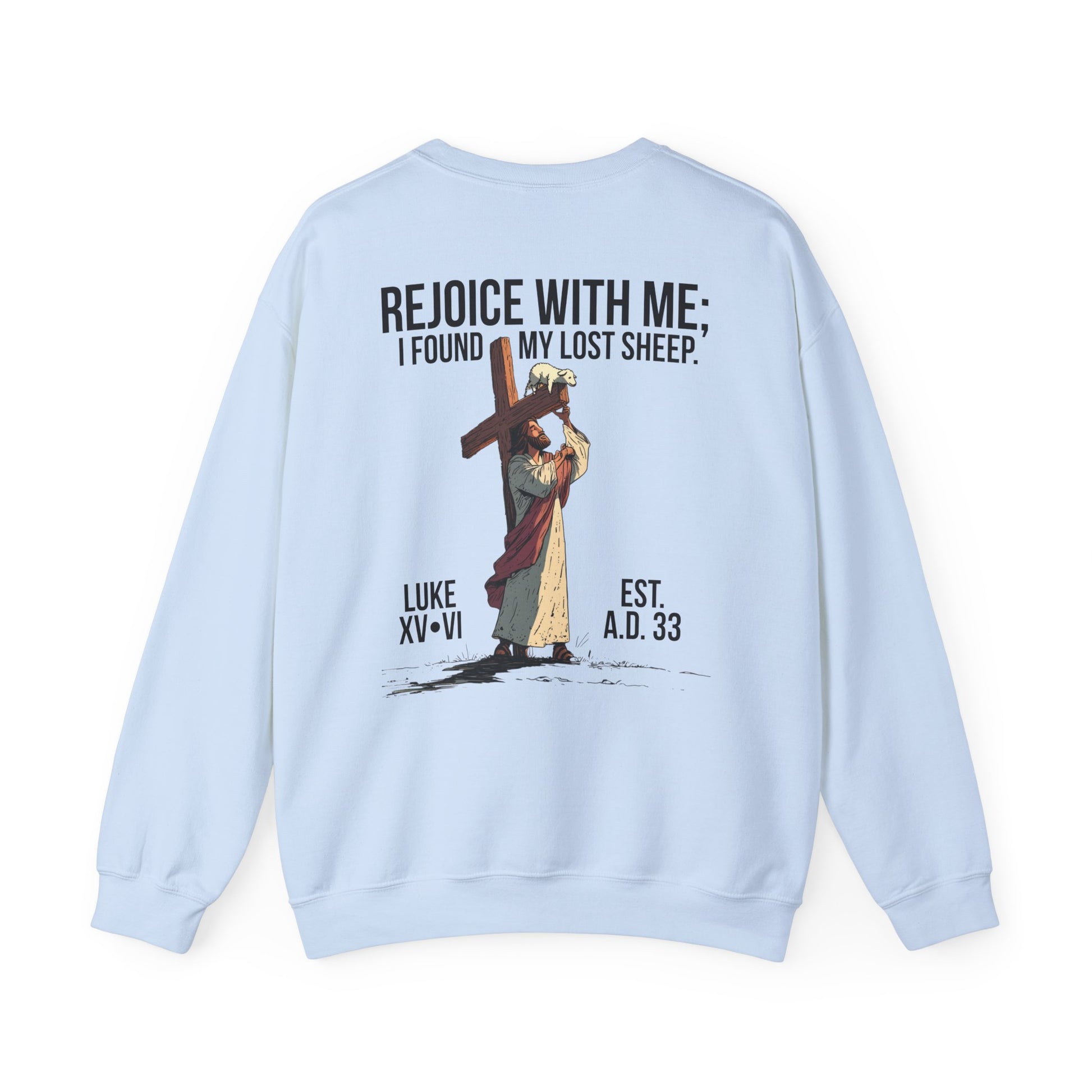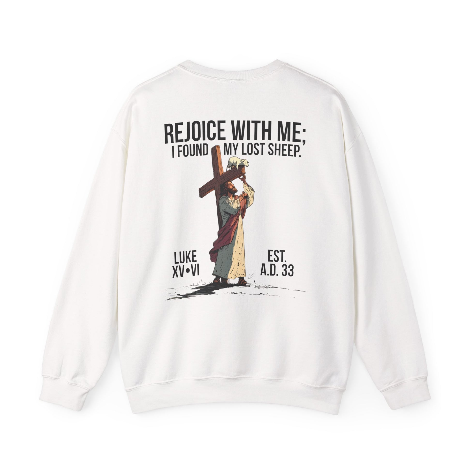 Inspired by Luke 15:6, this crewneck shows Jesus carrying the cross with a single lamb lifted up on the beam—symbolizing the believer lifted onto the very cross where His blood covers us in salvation. It pictures Christ not only seeking the one lost sheep, but also holding us up on that cross, bearing the weight we could never carry ourselves.
