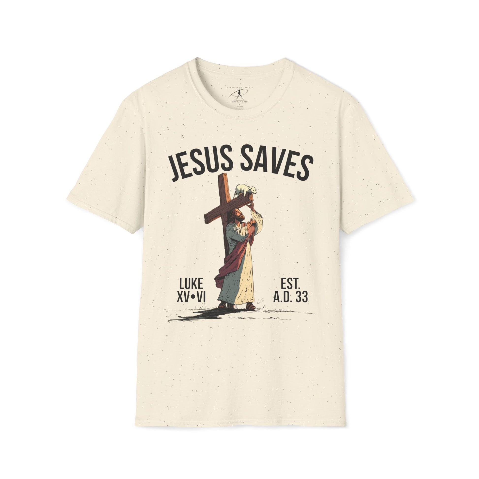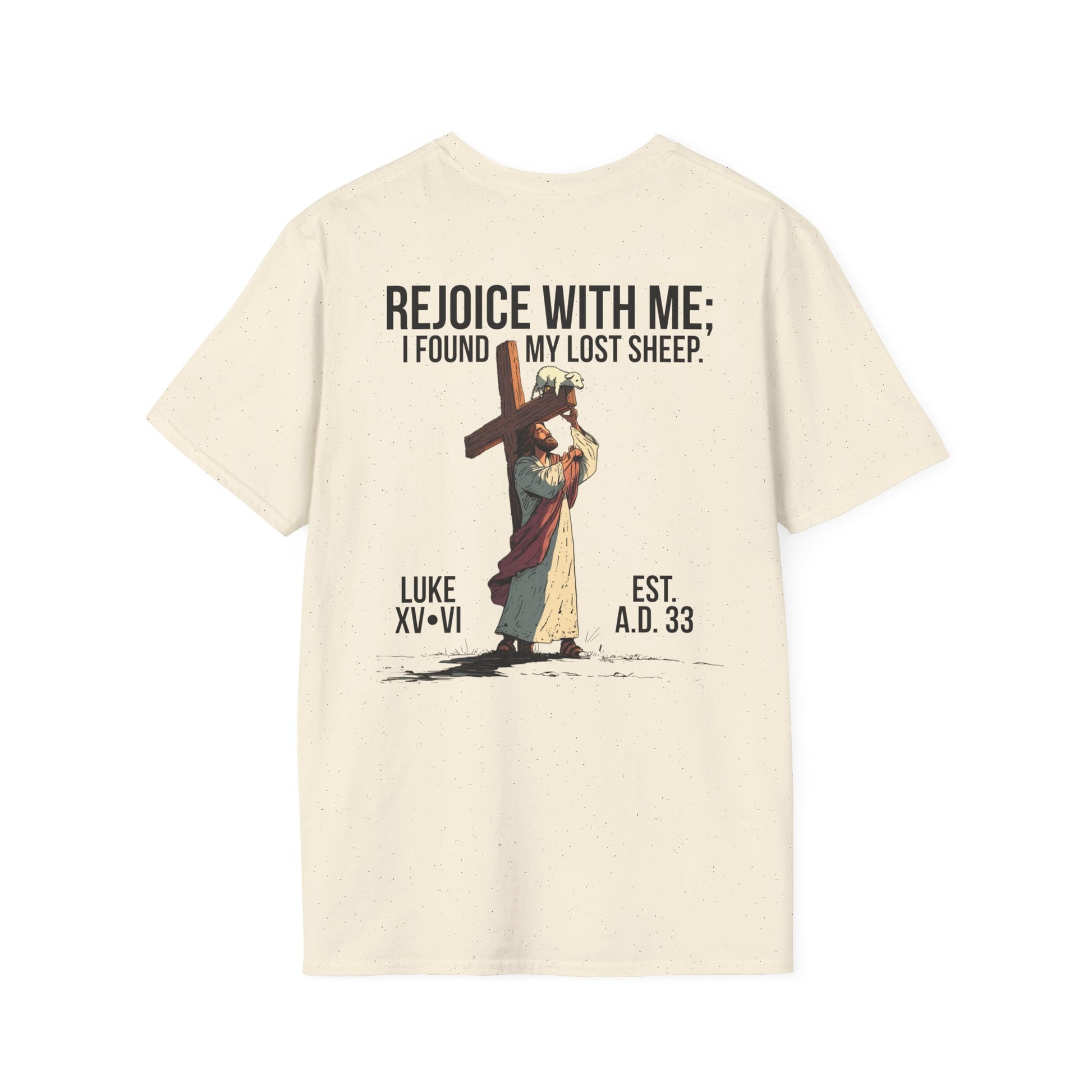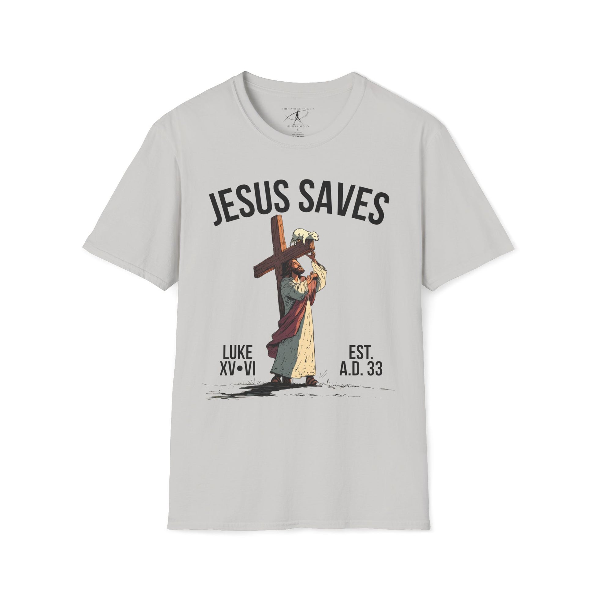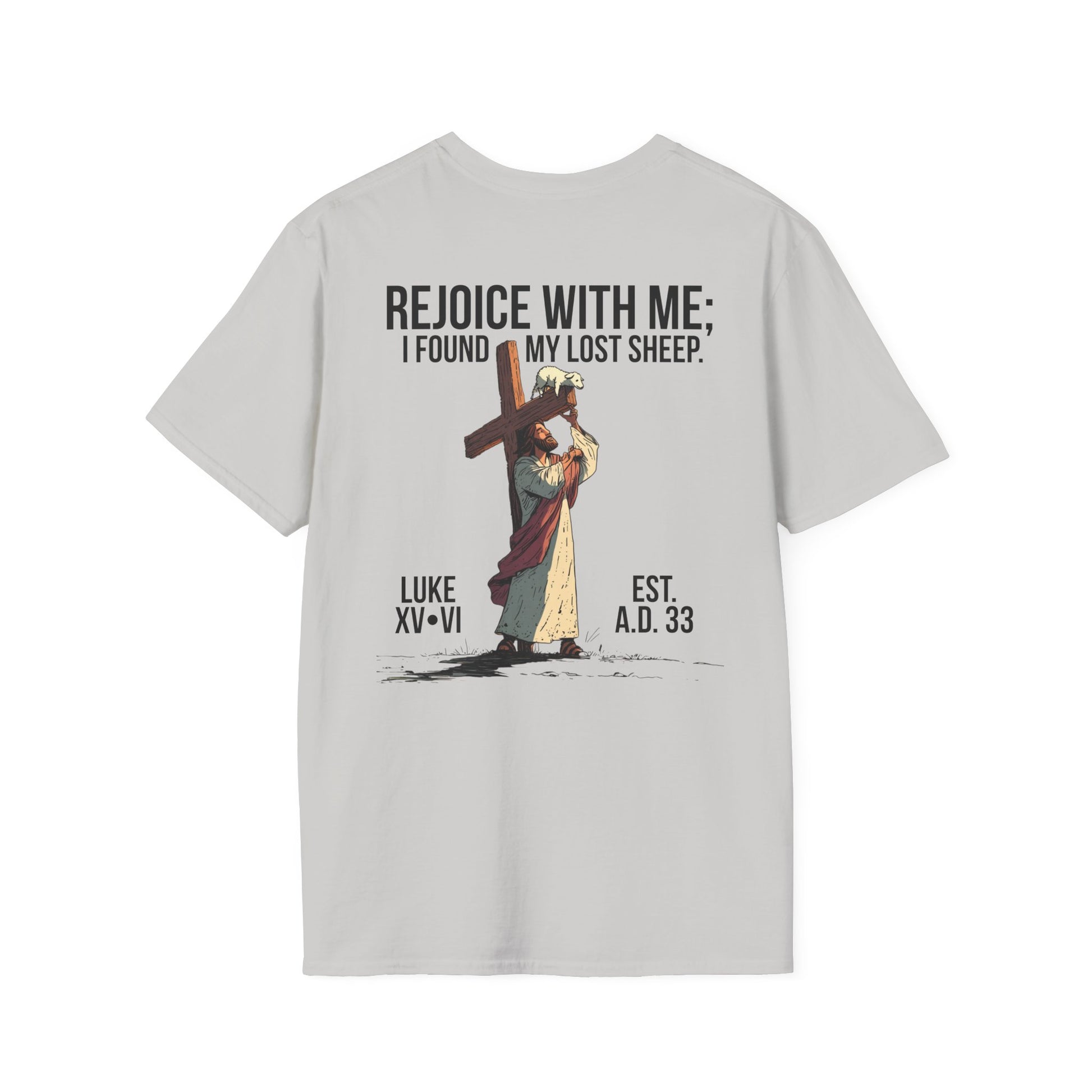 Inspired by Luke 15:6, this t-shirt shows Jesus carrying the cross with a single lamb lifted up on the beam—symbolizing the believer lifted onto the very cross where His blood covers us in salvation. It pictures Christ not only seeking the one lost sheep, but also holding us up on that cross, bearing the weight we could never carry ourselves. The graphic is a visual reminder that you are personally seen, pursued, carried, and redeemed by the blood of Jesus—and that there is more joy in Heaven over one sinner who repents than over ninety-nine who think they need no repentance. Put it on and remember: you are the church. Wherever you walk, you walk as a fisher of men—sent to seek the lost, just as He first sought you.