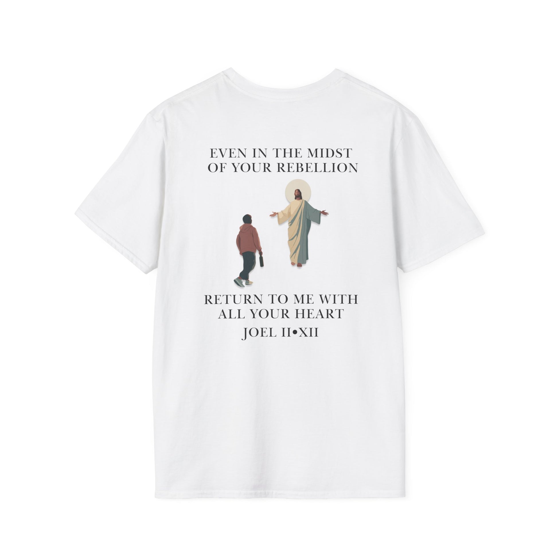 Inspired by Joel 2:12, this back-print gospel t-shirt features a minimalist Wherever We Walk Co. logo on the front and a full “Return to Me” scene on the back. The back design shows Jesus standing with open arms as a modern person walks toward Him, still holding a bottle in their hand—a picture of someone coming back to God in the middle of their mess, not after they’ve cleaned it up. The bottle is a symbol of any sin or weight you may still be holding, and yet Christ is still there, welcoming you with open arms. It echoes His call, “Return to Me with all your heart,” and the truth that grace meets us even in the midst of our rebellion.
